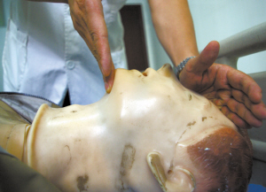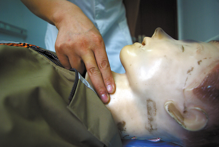 “確定患者昏迷后,我們需要再進(jìn)一步判斷?!睔W陽茴香說,我們可用兩指貼于跌倒者的頸部動(dòng)脈,看看是否有心跳,然后再看看其是否有呼吸。