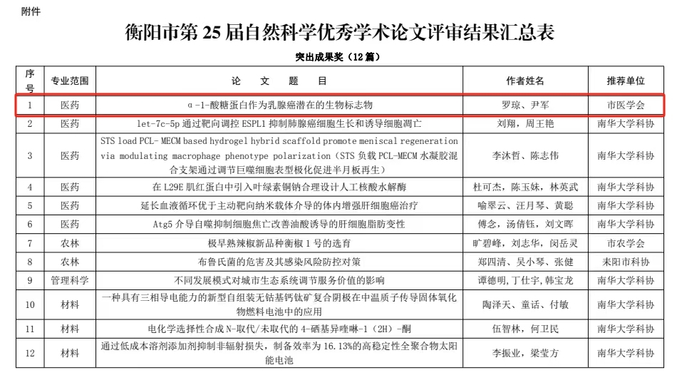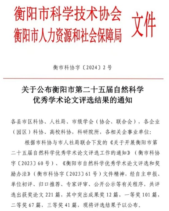 通訊員汪張毅、王環(huán)報道:近日,衡陽市科協(xié)技術(shù)協(xié)會發(fā)布《關(guān)于公布衡陽市第二十五屆自然科學(xué)優(yōu)秀學(xué)術(shù)論文評選結(jié)果的通知》(衡市科協(xié)字〔2024〕2號),衡陽市中心醫(yī)院在衡陽市第二十五屆自然科學(xué)優(yōu)秀學(xué)術(shù)論文評選中喜獲佳績。我院院長尹軍與乳甲外科主任羅瓊合著的論文《α-1-酸糖蛋白作為乳腺癌潛在的生物標(biāo)志物》榮獲突出成果獎;護(hù)理部汪張毅的論著論文《Needs for nurses to provide spiritual care and their associated influencing factors among elderly inpatients with stroke in China: A cross-sectional quantitative study》(中國老年腦卒中住院患者靈性照護(hù)需求現(xiàn)狀及其相關(guān)影響因素分析:一項橫斷面定量研究)榮獲一等獎,也是衡陽市護(hù)理學(xué)會推薦并獲獎的唯一一篇高質(zhì)量SCI論文。