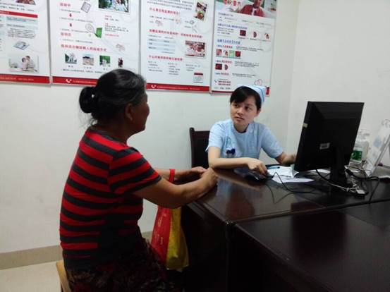 內(nèi)分泌科護(hù)士長劉丹在健康教育綜合內(nèi)科門診室耐心接受糖尿病患者的咨詢