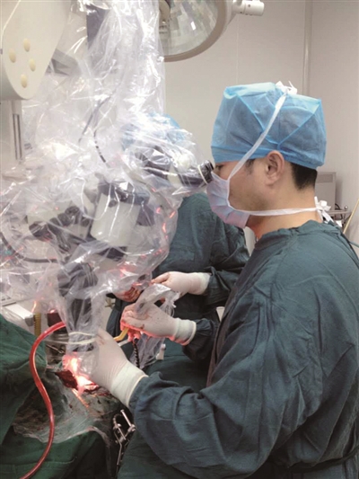鐘主任正在為患者實(shí)行腦動脈瘤顯微夾閉術(shù)。