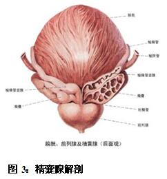 1、精囊腺的解剖及功能: 精囊腺位于膀胱底與直腸之間,在輸精管末端的外側(cè)。是一對(duì)長橢圓形的囊狀器官,表面凹凸不平,下端為排泄管,與輸精管末端匯合成射精管(圖3)。精囊腺分泌精囊液(果糖、凝固蛋白Semenogelin 1,前列腺素等),成為精液的一部分。精囊能儲(chǔ)存少量精子,且有豐富微血管,極易損傷出血;性高潮射精時(shí),平滑肌強(qiáng)烈收縮,微血管破裂出現(xiàn)血精。