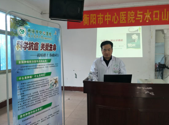 仁濟(jì)專家赴常寧水口山鎮(zhèn)開展抗癌科普義診 發(fā)布時間:2018年4月23日 預(yù)覽:2605次 來源:中國衡陽新聞網(wǎng) 2018-04-21 作者:殷君發(fā) 通訊員殷君發(fā)報道 4月15日—21日是第24屆“全國腫瘤防治宣傳周”,今年的主題是“科學(xué)抗癌,關(guān)愛生命,抗癌路上,你我同行”。21日,衡陽市中心醫(yī)院腫瘤內(nèi)科一區(qū)主任唐玉成、副主任醫(yī)師劉騫一行6名專家,與水口山職工醫(yī)院一道赴常寧市水口山鎮(zhèn)開展抗癌科普義診活動,當(dāng)?shù)亟?00名居民前來咨詢義診。 活動現(xiàn)場,專家們?yōu)榍皝碜稍兊木用窦?xì)心診治、耐心解釋、宣講防癌抗癌知識,許多人緊鎖的眉頭解開了。有2名水口山居民是唐玉成主任的老病人。一名肖姓患者接受肺癌手術(shù)后,18年來,唐玉成主任一直為其精心制定放療、化療方案,定期開展放療、化療,現(xiàn)在精神矍鑠,開朗樂觀,見到唐主任親切地猶如家人,家人稱唐主任為“救命恩人”。另一名騰姓患者,6年前接受前列腺癌手術(shù)后,一直是唐玉成為其實施內(nèi)分泌治療,老人感慨:患癌并不可怕,只要科學(xué)抗癌、堅定信心,一定會平安無事!唐玉成主任還以《讓我們一起認(rèn)識癌癥》為題,為居民開展腫瘤防治科普講座。 下午,劉騫以《腫瘤治療的“十八般武器”》為題,與水口山職工醫(yī)院的醫(yī)務(wù)人員開展學(xué)術(shù)講座和學(xué)術(shù)交流。 相關(guān)鏈接:1.http://m.btime.com/item/router?gid=425j9thi9ib9ii9cf1ouk8iv5jq&from=singlemessage2.http://sdjs.chinareports.org.cn/ylws/2018/0421/4717.html?1524307857=&from=singlemessage3.http://epaper.hyqss.cn/html/2018-05/01/content_4_2.htm