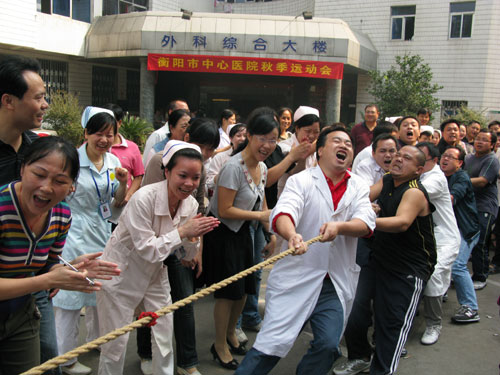 我院秋季運(yùn)動(dòng)會(huì)圓滿落幕 發(fā)布時(shí)間:2008年10月24日 預(yù)覽:4029次 本報(bào)訊 在新醫(yī)改即將出臺(tái)的社會(huì)背景下,市中心醫(yī)院致力于加強(qiáng)醫(yī)院文化建設(shè)、科技進(jìn)步和人才隊(duì)伍建設(shè),以提升醫(yī)院綜合實(shí)力和促進(jìn)持續(xù)發(fā)展。最近,該院組織全院醫(yī)務(wù)人員和患者舉行了一場(chǎng)聲勢(shì)浩大的秋季運(yùn)動(dòng)會(huì),開(kāi)展登山、籃球、乒乓球、拔河、象棋等項(xiàng)目比賽,進(jìn)一步激發(fā)了醫(yī)務(wù)人員的工作熱情,融洽了醫(yī)患關(guān)系。圖為拔河比賽場(chǎng)景。 (鄒建軍)